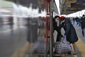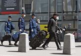 Москва во время режима самоизоляции из-за опасности распространения коронавирусной инфекции COVID-19. Жанровая фотография. Пассажиры в медицинских масках с вещами на Ленинградском вокзале.