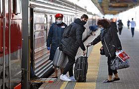 Москва во время режима самоизоляции из-за опасности распространения коронавирусной инфекции COVID-19. Жанровая фотография. Проводница и пассажиры в медицинских масках перед посадкой на поезд на Ленинградском вокзале.