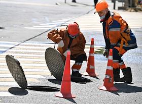 Москва во время режима самоизоляции из-за опасности распространения коронавирусной инфекции COVID-19. Жанровая фотография. Сотрудники дорожной службы в медицинских масках во время ремонта.