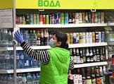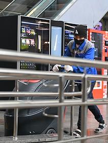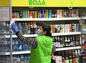 Москва во время режима самоизоляции из-за опасности распространения коронавирусной инфекции COVID-19. Жанровая фотография. Ленинградский вокзал. Продавец в медицинской маске протирает витрину.