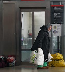 Москва во время режима самоизоляции из-за опасности распространения коронавирусной инфекции COVID-19. Жанровая фотография. Пожилая женщина с сумками на Ленинградском вокзале.