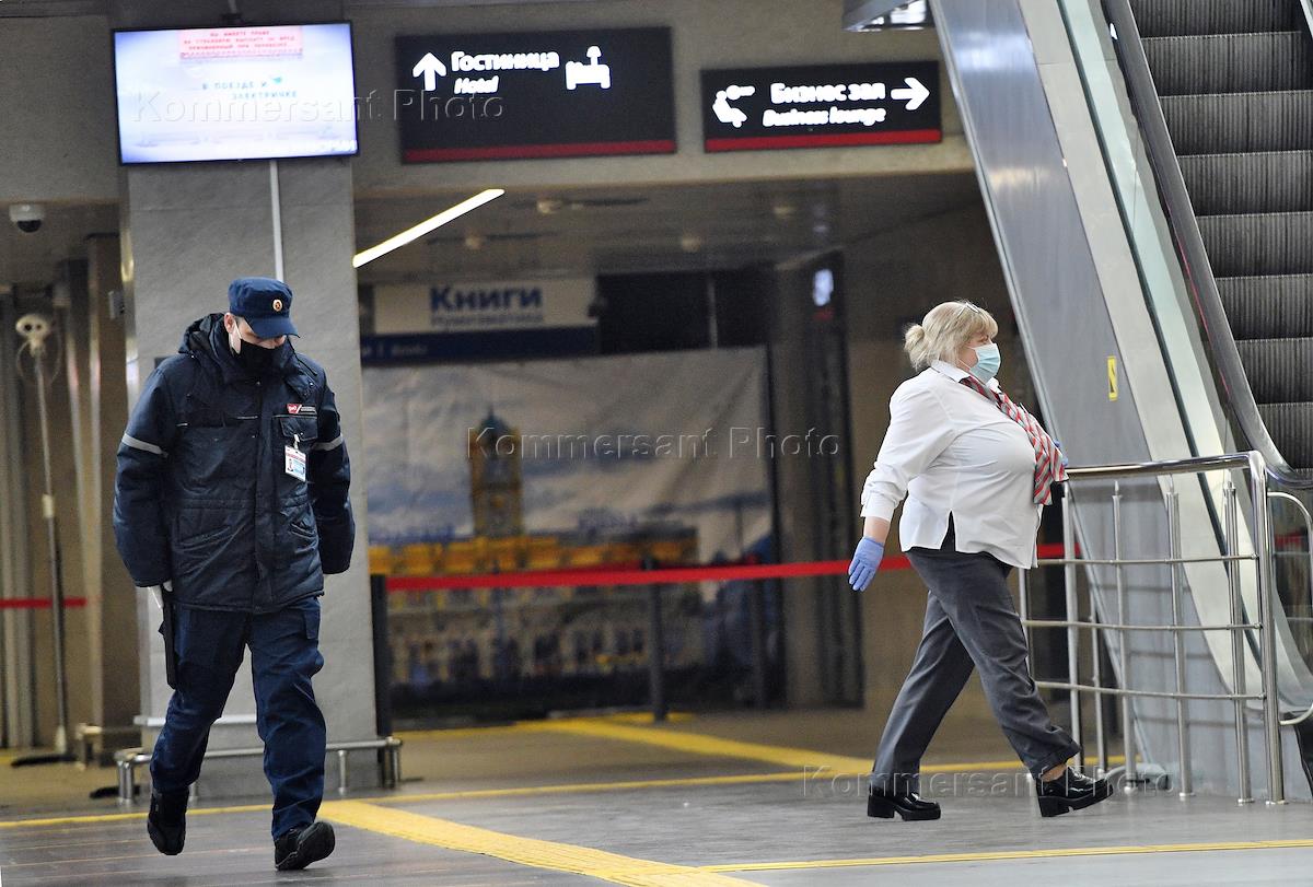 Москва во время режима самоизоляции из-за опасности распространения коронавирусной инфекции COVID-19. Жанровая фотография. Сотрудники Ленинградского вокзала в медицинских масках.