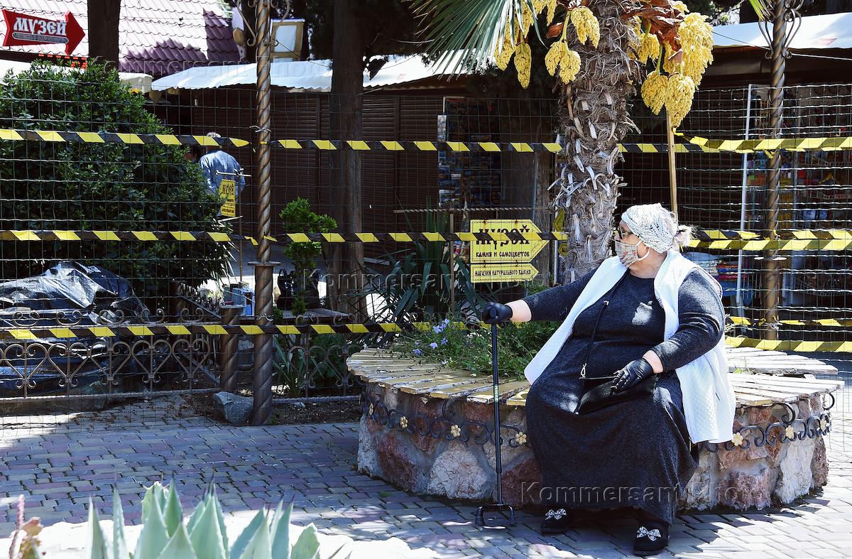 Виды Ялты после отмены в Крыму режима самоизоляции из-за опасности распространения ккоронавирусной инфекции COVID-19. Жанровая фотография. Пожилая женщина в медицинской маске и перчатках сидит на лавочке под пальмой.
