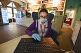 Сеть кафе "АндерСон" во время режима самоизоляции из-за опасности распространения коронавирусной инфекции COVID-19. Жанровая фотография. Сотрудница кафе в медицинской маске и перчатках во время работы.