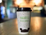 Сеть кафе "АндерСон" во время режима самоизоляции из-за опасности распространения коронавирусной инфекции COVID-19. Жанровая фотография. Одноразовый стаканчик с надписью "Улыбайтесь! Это всех заряжает!".