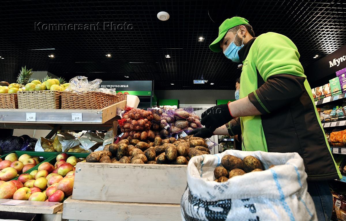 Москва во время режима самоизоляции из-за опасности распространения коронавирусной инфекции COVID-19. Жанровая фотография. Сотрудник магазина "ВкусВилл" в медицинской маске и перчатках в овощном отделе.