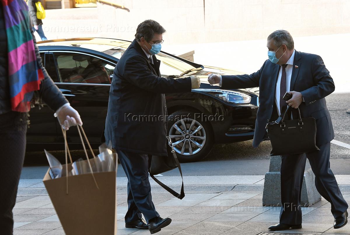 Меры предосторожности из-за угрозы распространения коронавирусной инфекции COVID-19. Прибытие членов Совета Федерации (СФ) России на пленарное заседание. Представитель в СФ России от исполнительного органа государственной власти Республики Алтай Владимир Полетаев (слева) перед началом заседания.