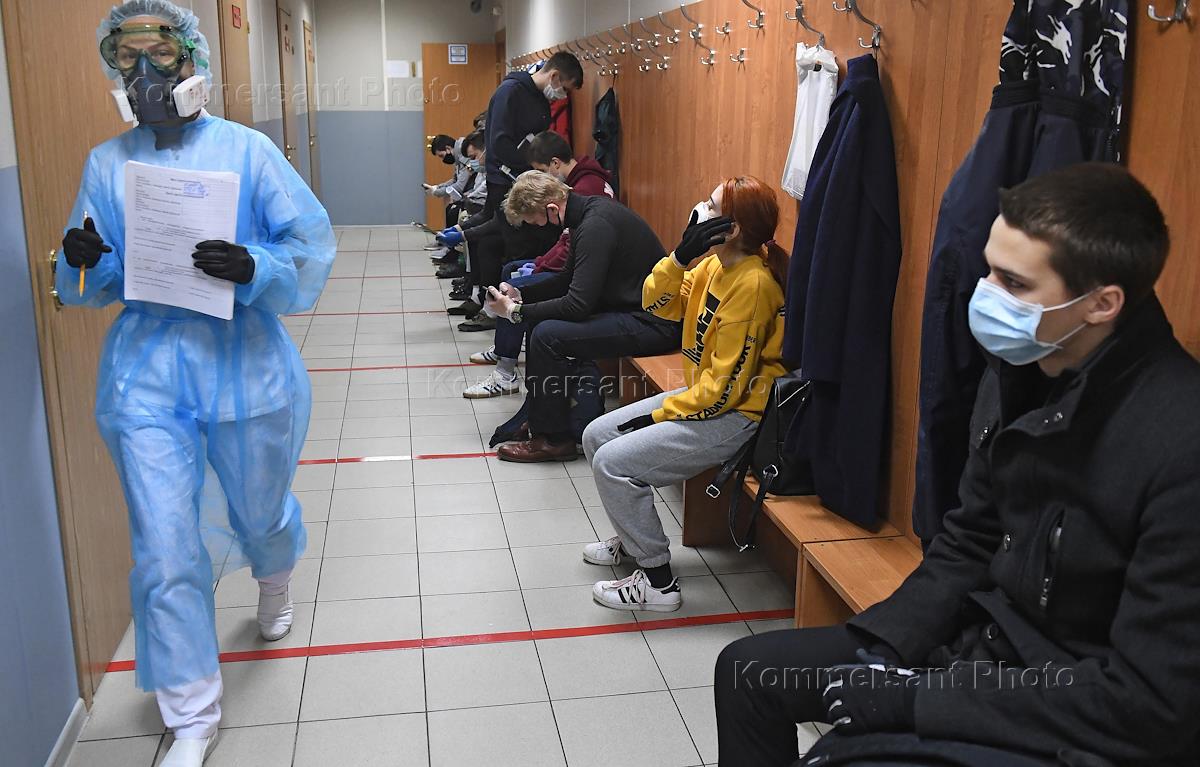 Весенняя призывная кампания во время режима самоизоляции из-за опасности распространения коронавирусной инфекции COVID-19. Жанровая фотография. Медицинский работник и призывники в медицинских масках на сборном призывном пункте Военного комиссариата города Москвы.