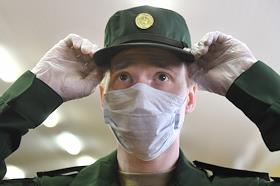 Весенняя призывная кампания во время режима самоизоляции из-за опасности распространения коронавирусной инфекции COVID-19. Жанровая фотография. Сотрудник военной полиции в медицинской маске на сборном призывном пункте Военного комиссариата города Москвы.