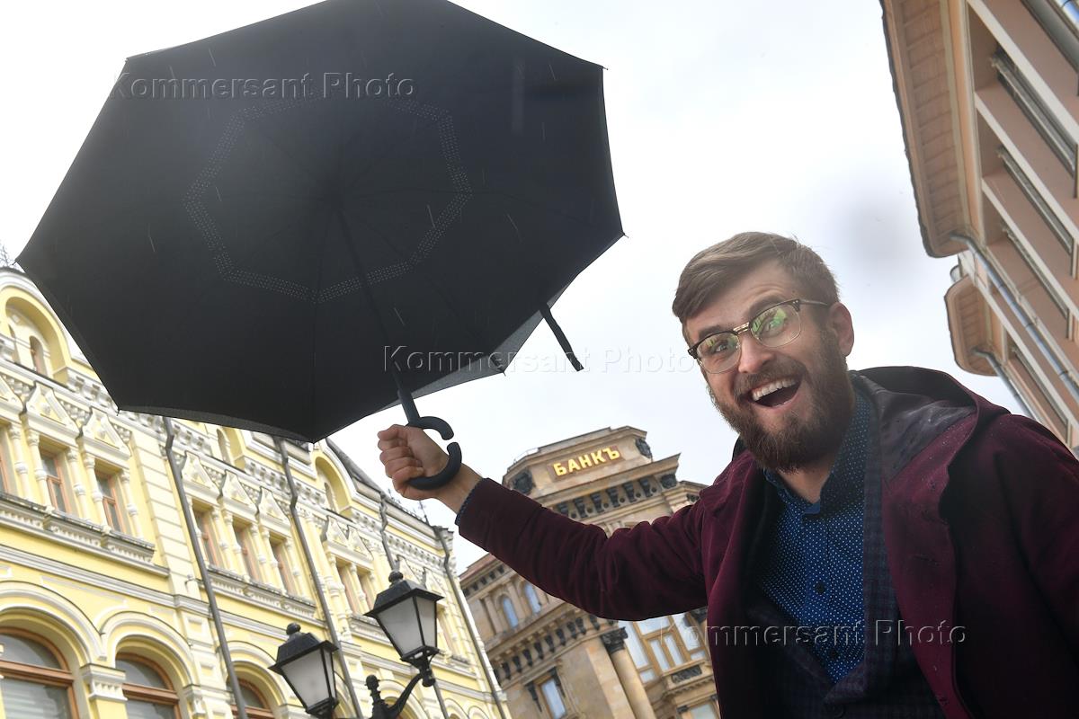 Жанровая фотография. Мужчина под зонтом возле здания Московского международного торгового банка на углу улиц Кузнецкий Мост и Рождественка.