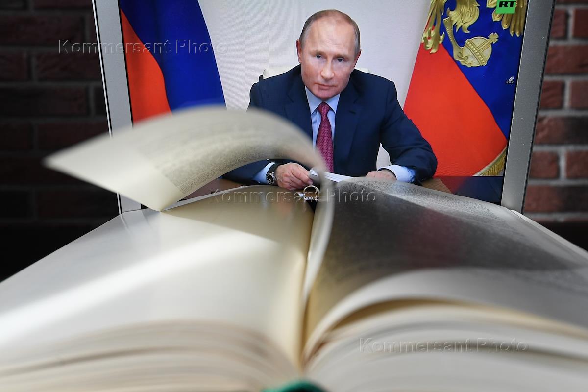 Режим самоизоляции из-за опасности распространения коронавирусной инфекции COVID-19. Жанровая фотография. Трансляция совещания президента России Владимира Путина в режиме видеоконференции по образованию.