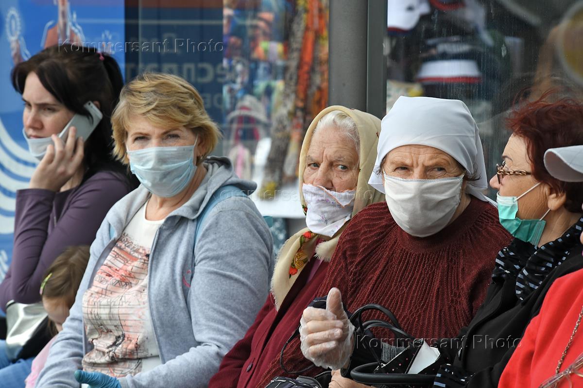 Крым после отмены режима самоизоляции из-за опасности распространения коронавирусной инфекции COVID-19. Жанровая фотография. Пассажиры в медицинских масках на остановке общественного транспорта.