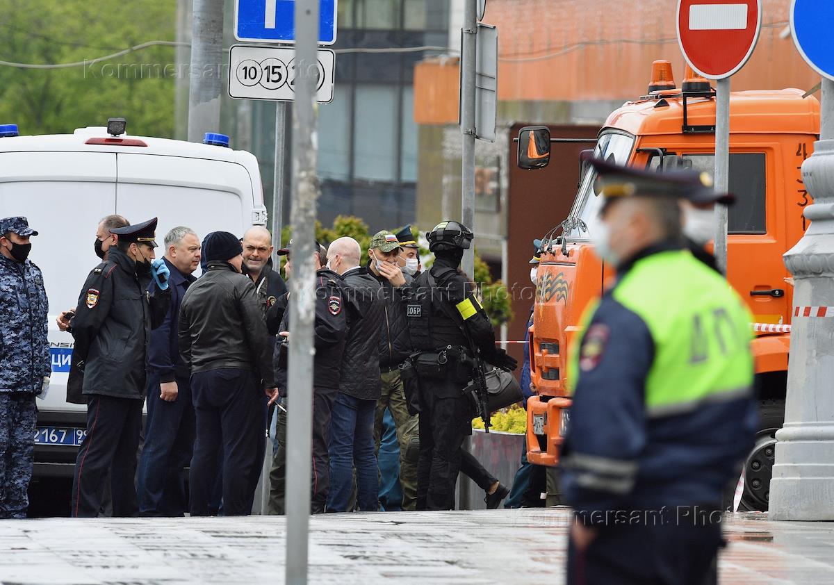 Ситуация вокруг офиса "Альфа-банка" на Земляном Валу, где мужчина пытался взять в заложники сотрудников и посетителей банка. Сотрудники полиции в медицинских масках на месте происшествия.