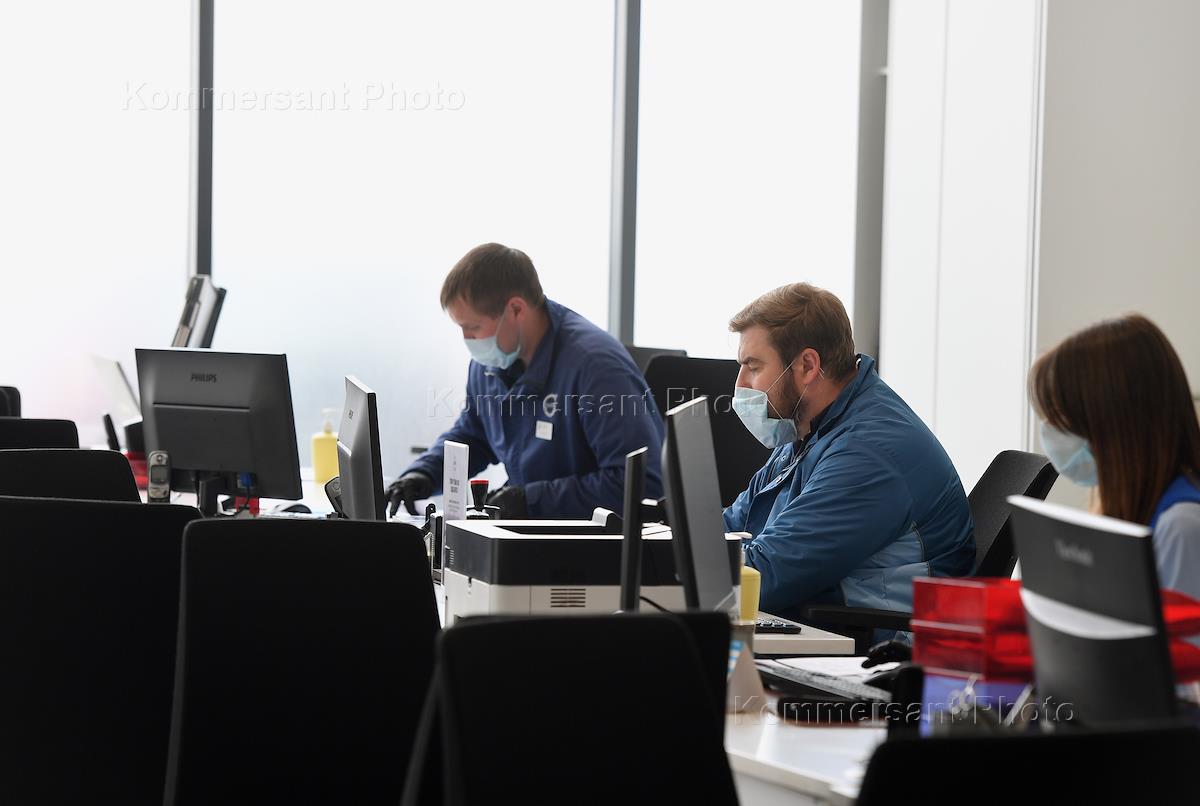 Москва во время режима самоизоляции из-за опасности распространения коронавирусной инфекции COVID-19. Жанровая фотография. Работа официального дилера Volvo автоцентра "Volvo Car M1". Сотрудники автоцентра в медицинских масках.