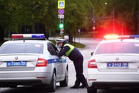 Москва во время режима самоизоляции из-за опасности распространения коронавирусной инфекции COVID-19. Жанровая фотография. Сотрудник дорожно-патрульной службы во время проверки документов у водителя.