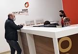 Режим самоизоляции из-за опасности распространения коронавирусной инфекции COVID-19. Жанровая фотография. Посетитель в медицинской маске перед стойкой информации многофункционального центра (МФЦ) "Бескудниковский и Восточное Дегунино".