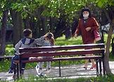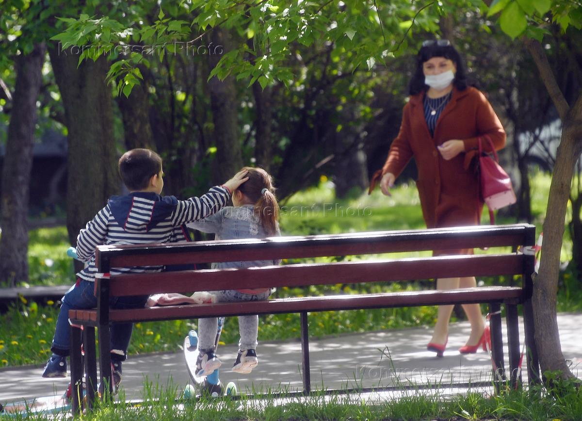 Режим самоизоляции из-за опасности распространения коронавирусной инфекции COVID-19. Жанровая фотография. Женщина в медицинской маске проходит мимо лавочки с двумя детьми.