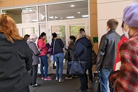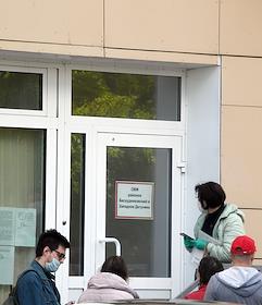 Режим самоизоляции из-за опасности распространения коронавирусной инфекции COVID-19. Жанровая фотография. Посетители в медицинских масках перед входом в многофункциональный центр (МФЦ) "Бескудниковский и Восточное Дегунино".