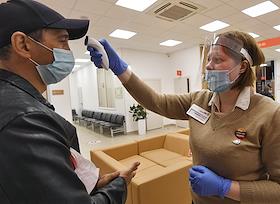 Режим самоизоляции из-за опасности распространения коронавирусной инфекции COVID-19. Жанровая фотография. Сотрудница многофункционального центра (МФЦ) "Бескудниковский и Восточное Дегунино" во время дистанционного измерения температуры посетителя.