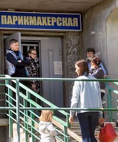 Режим самоизоляции из-за опасности распространения коронавирусной инфекции COVID-19. Жанровая фотография. Посетители в медицинских масках перед входом в парикмахерскую.