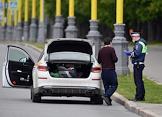 Режим самоизоляции из-за опасности распространения коронавирусной инфекции COVID-19. Жанровая фотография. Сотрудник дорожно-патрульной службы во время проверки автомобиля "Яндекс. Такси".