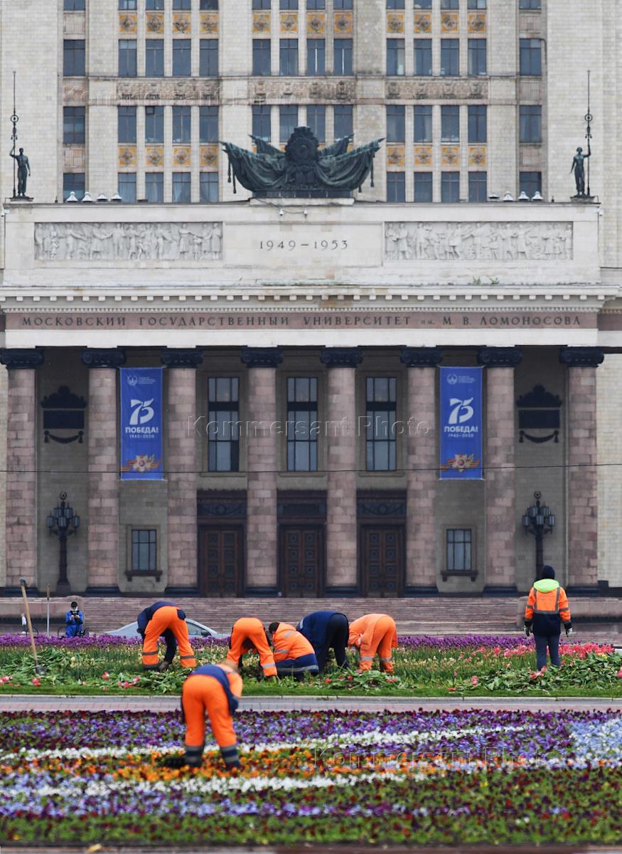Режим самоизоляции из-за опасности распространения коронавирусной инфекции COVID-19. Жанровая фотография. Сотрудники коммунального хозяйства во время высадки цветов на площадь перед зданием Московского государственного университета имени Ломоносова.