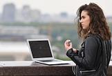 Режим самоизоляции из-за опасности распространения коронавирусной инфекции COVID-19. Жанровая фотография. Девушка с ноутбуком на смотровой площадке Воробьевых гор.