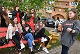 Москва во время режима самоизоляции из-за опасности распространения коронавирусной инфекции COVID-19. Жанровая фотография. Выпускники средней школы, празднующие "Последний звонок".