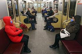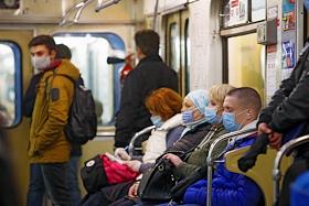 Киевский метрополитен после возобновления пассажирских перевозок после почти двух месяцев режима карантина из-за опасности распространения коронавирусной инфекции COVID-19. Жанровая фотография. Пассажиры в вагоне поезда метро.