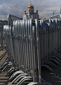 Москва во время режима самоизоляции из-за опасности распространения коронавирусной инфекции COVID-19. Жанровая фотография. Храм Христа Спасителя и металлические ограждения.