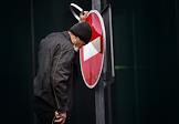 Москва во время режима самоизоляции из-за опасности распространения коронавирусной инфекции COVID-19. Жанровая фотография. Рабочий в медицинской маске устанавливает дорожный знак "Проезд запрещен".