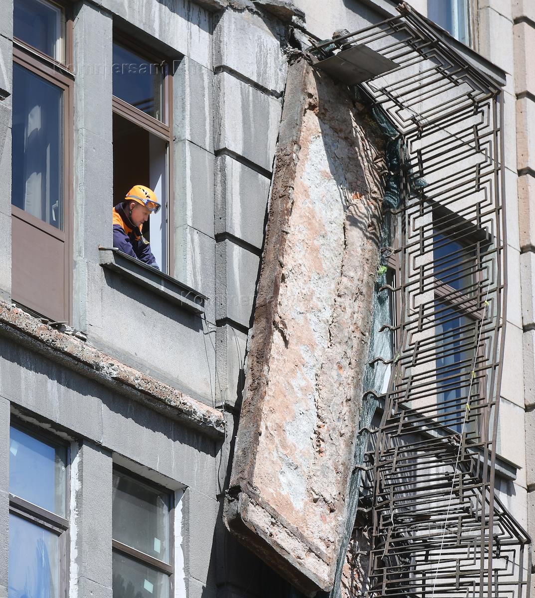 St. Petersburg during self-isolation regime caused by the danger of the coronavirus COVID-19 spread. Collapse of the balconies from the sixth to the third floor on Kirochnaya street, in the house No. 20. Dismantling of the balconies.