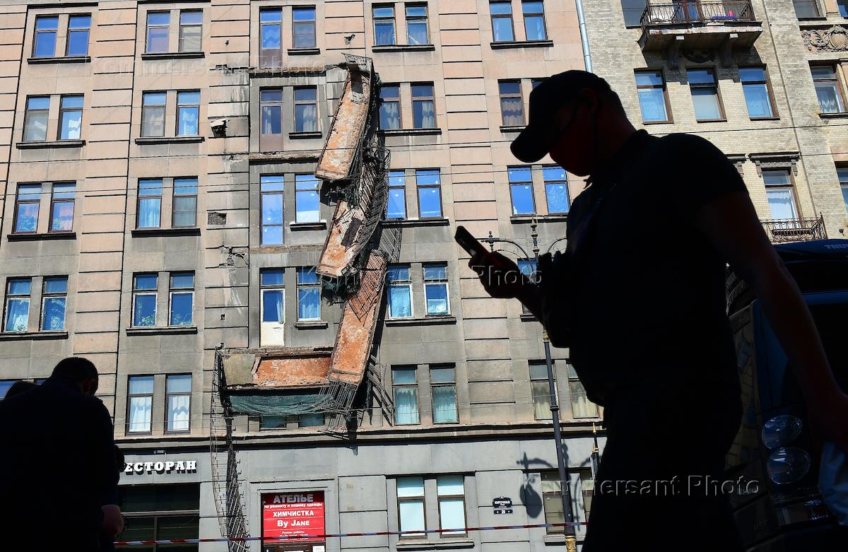 St. Petersburg during self-isolation regime caused by the danger of the coronavirus COVID-19 spread. Collapse of the balconies from the sixth to the third floor on Kirochnaya street, in the house No. 20. Passers-by wearing face masks are seen at the accident site.