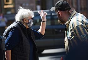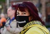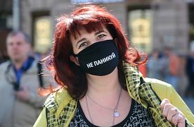 Санкт-Петербург во время режима самоизоляции из-за опасности распространения коронавирусной инфекции COVID-19. Обрушение балконов с шестого по третий этаж на Кирочной улице, в доме № 20. Женщина в маске с надписью: "Не паникуй" на месте происшествия.