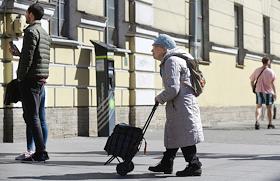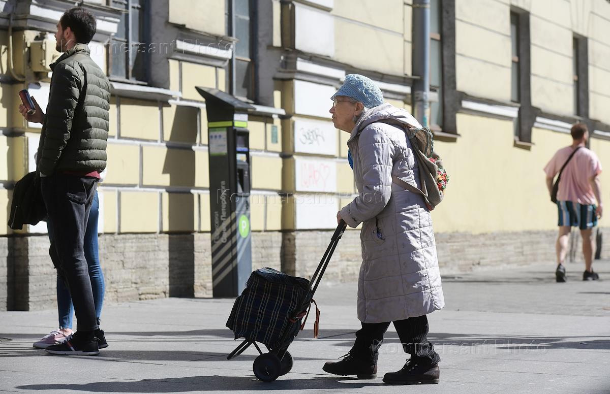 Санкт-Петербург во время режима самоизоляции из-за опасности распространения коронавирусной инфекции COVID-19. Жанровые фотографии. Пожилая женщина с сумкой тележкой.