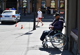 Санкт-Петербург во время режима самоизоляции из-за опасности распространения коронавирусной инфекции COVID-19. Жанровые фотографии. Пожилой мужчина в инвалидном кресле.