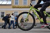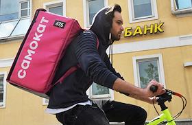 Жанровая фотография. Курьер службы доставки еды "Самокат" на велосипеде возле отделения банка "Райффайзен Банк" (Raiffeisen Bank).