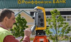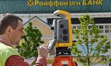 Жанровая фотография. Геодезист с тахеометром рядом с отделением банка "Райффайзен Банк" (Raiffeisen Bank).
