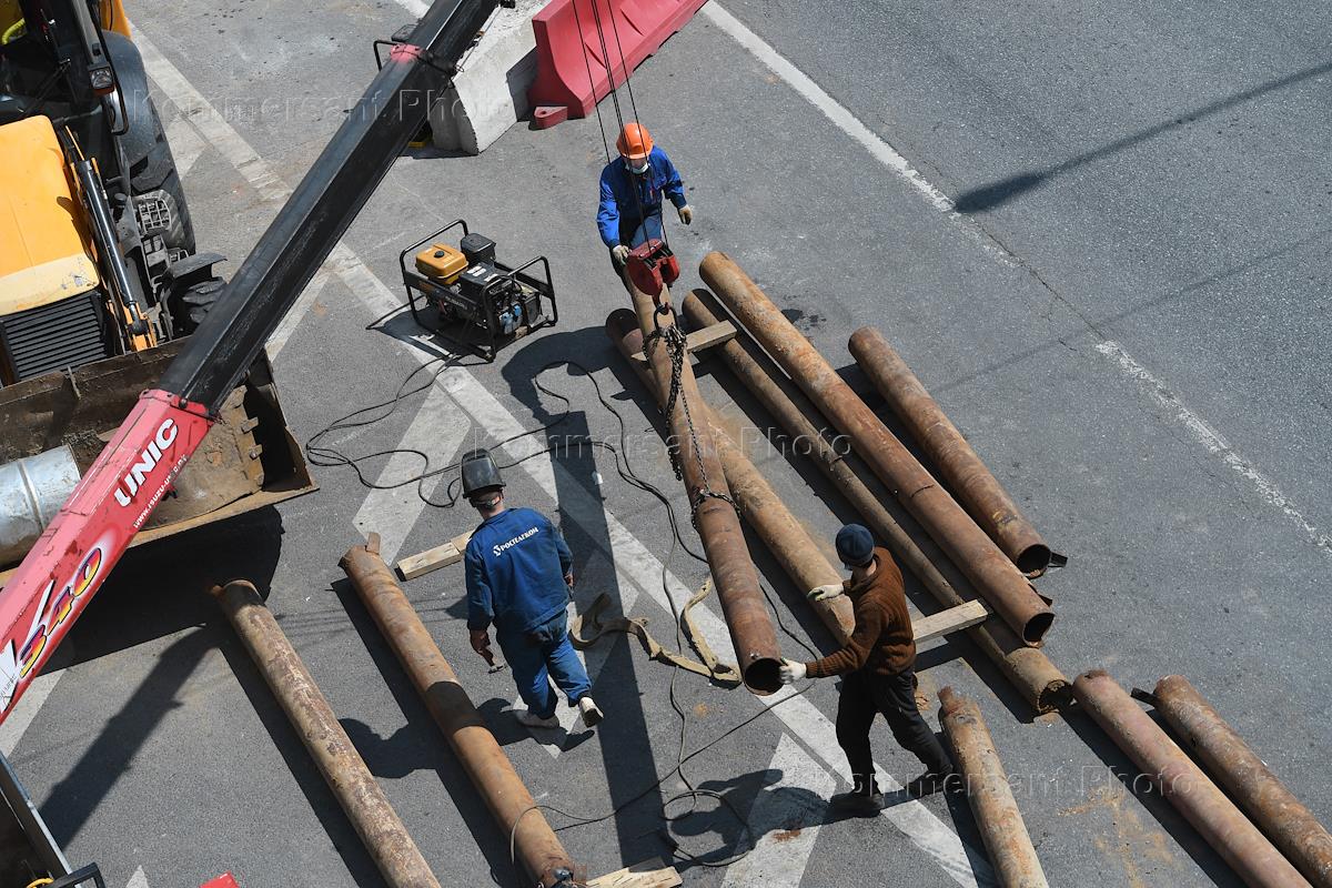 Виды Москвы во время режима самоизоляции из-за опасности распространения коронавирусной инфекции COVID-19. Жанровая фотография. Пустой город. Рабочие во время ремонтных работ.
