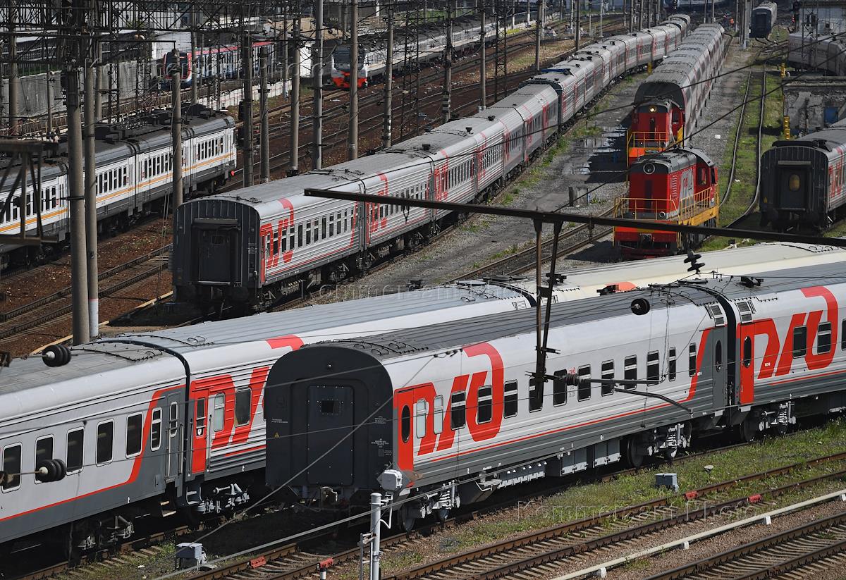 Виды Москвы во время режима самоизоляции из-за опасности распространения коронавирусной инфекции COVID-19. Жанровая фотография. Пустой город. Поезда на запасных путях железнодорожного депо.