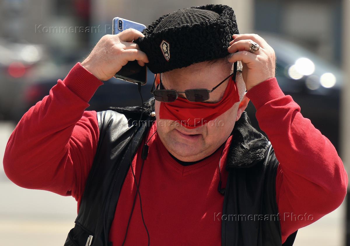 Москва во время режима самоизоляции из-за опасности распространения коронавирусной инфекции COVID-19. Жанровая фотография. Сотовая связь. Прохожие в медицинских масках.