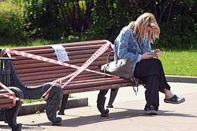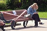 Москва во время режима самоизоляции из-за опасности распространения коронавирусной инфекции COVID-19. Жанровая фотография. Сотовая связь. Девушка с мобильным телефоном сидит на скамейке, перетянутой оградительной лентой.