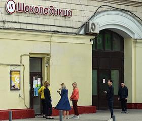Москва во время режима самоизоляции из-за опасности распространения коронавирусной инфекции COVID-19. Жанровая фотография. Очередь за заказами на вынос в кафе "Шоколадница".