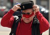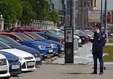 Москва во время режима самоизоляции из-за опасности распространения коронавирусной инфекции COVID-19. Жанровая фотография. Сотовая связь. Сотрудник службы Московского паркинга в медицинской маске говорит по мобильному телефону у платной парковки.