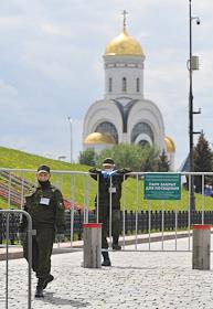 Москва во время режима самоизоляции из-за опасности распространения коронавирусной инфекции COVID-19. Жанровая фотография. Сотрудники охраны у ограждения закрытого парка на Поклонной горе.
