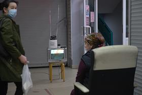 Москва во время режима самоизоляции из-за опасности распространения коронавирусной инфекции COVID-19. Жанровая фотография. Телевизионная антенна на старом телевизоре в холле парикмахерской.