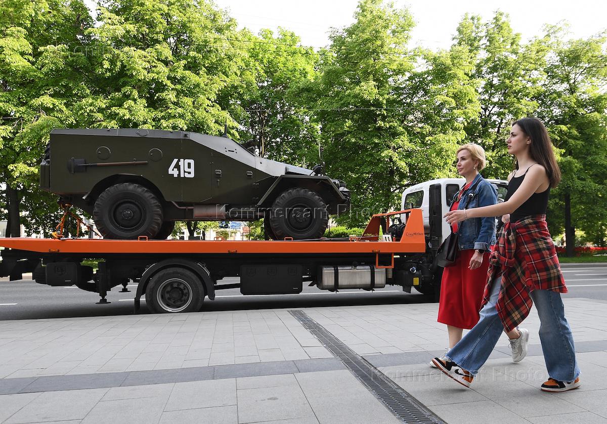 Москва во время режима самоизоляции из-за опасности распространения коронавирусной инфекции COVID-19. Празднование Дня пограничника Межрегиональной общественной организации "Военно-техническое общество". Задержанные бронемашины, участвовавшие в пробеге по улицам города.