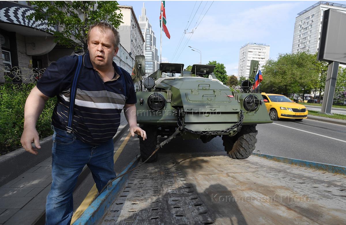 Москва во время режима самоизоляции из-за опасности распространения коронавирусной инфекции COVID-19. Празднование Дня пограничника Межрегиональной общественной организации "Военно-техническое общество". Колонна бронемашин проехала по улицам города. Эвакуация задержанной военной техники, участвовавшей в пробеге по улицам города.