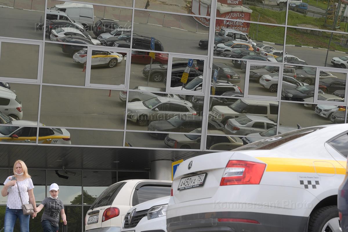 Москва во время режима самоизоляции из-за опасности распространения коронавирусной инфекции COVID-19. Жанровая фотография. Автомобили ""Яндекс. Такси" отражаются в стеклянном фасаде административного здания.
