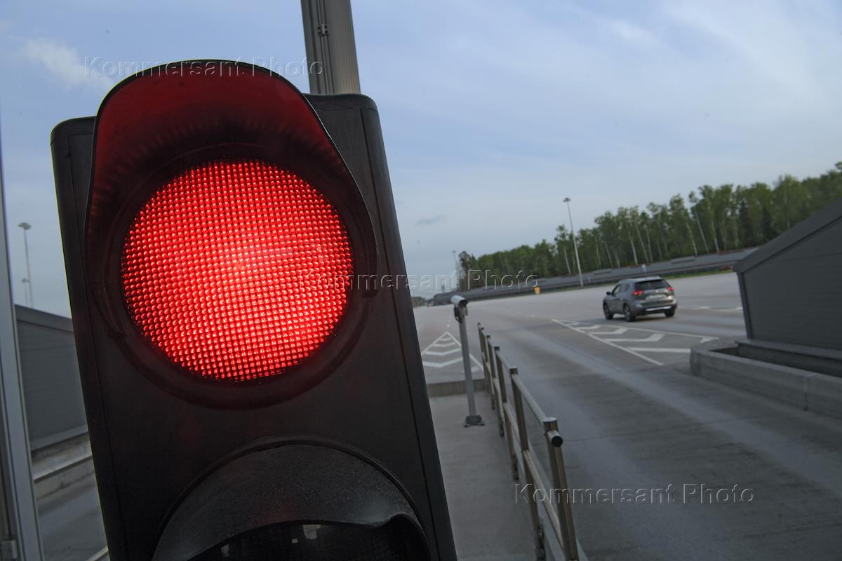 Москва во время режима самоизоляции из-за опасности распространения коронавирусной инфекции COVID-19. Жанровая фотография. Автомобиль во время выезда с пункта взимания платы (ПВП) на платной автомобильной дороге.